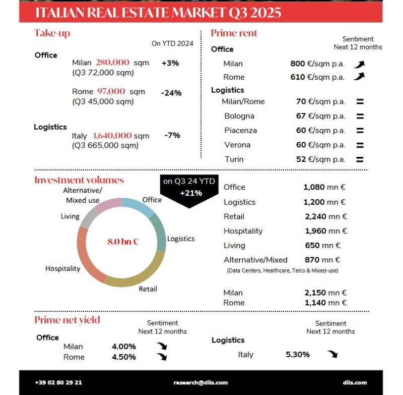 L’analisi del Team Research di Dils evidenzia che il terzo trimestre del 2025 si è chiuso con investimenti pari a 2,6 miliardi di euro, registrando una lieve flessione rispetto allo stesso periodo del 2024. Considerando i primi nove mesi dell’anno, il mercato italiano ha tuttavia attratto circa 8 miliardi di euro, in crescita del 21% rispetto allo stesso periodo del 2024, confermando il sentiment di fiducia dei player del settore immobiliare.